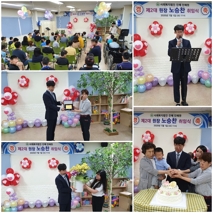 2020년 7월 1일(수) 인혜원 제2대 원장 노승찬 원장님의 취임식을 진행하였습니다. 코로나 19로 인해 시설 입주자와 직원분들만 모여서 함께 축하하는 자리를 가졌는데 직원들의 마음으로 모아 취임패와 취임 화분 등을 전달하였고, 그동안 인혜원을 수고해주신 이금주 원장님에게는 감사패를 전달하는 등 뜻 깊은 시간들을 보내었습니다. 앞으로도 변화하고 성장 할 인혜원을 지켜봐주시기를 바랍니다.