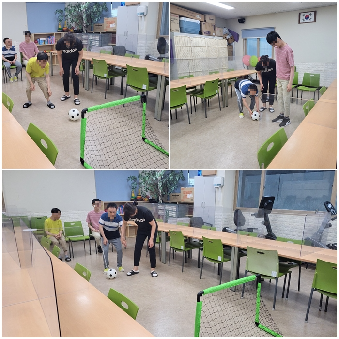 축구에 관심이 있는 입주자분들을 대상으로 진행을 하며 요즘처럼 장마나 무더운 여름 날씨에는 시설 내에서도 활동을 하실 수가 있도록 미니 축구대를 활용하여 축구를 해보고 있습니다. 소규모로 진행을 하다보니 여러번 참여가 가능하고 입주자분들도 참여도가 좋아서 만족도가 높은 활동입니다.